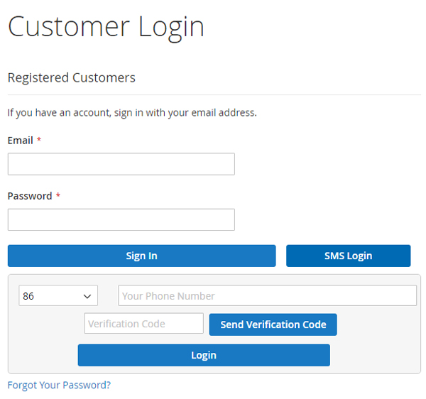 SunflowerBiz SMS Login extension offers a fast and secure way for customers to log into your Magento store by entering their mobile numbers to receive the verification code with SMS. After customers enter the correct verification code, they will log into your Magento store automatically. This extension integrates short message services provided by Alibaba Cloud and Tencent Cloud . It supports both domestic and international mobile numbers.
