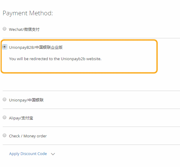 - Customers can select UnionPay B2B as a payment method to checkout.