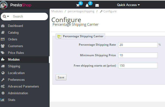 This shipping module allows you to set a percentage of the total order amount as the shipping fee and set a minimum shipping fee for all the orders.Also, we add a quick option to set free shipping over a specific order amount.